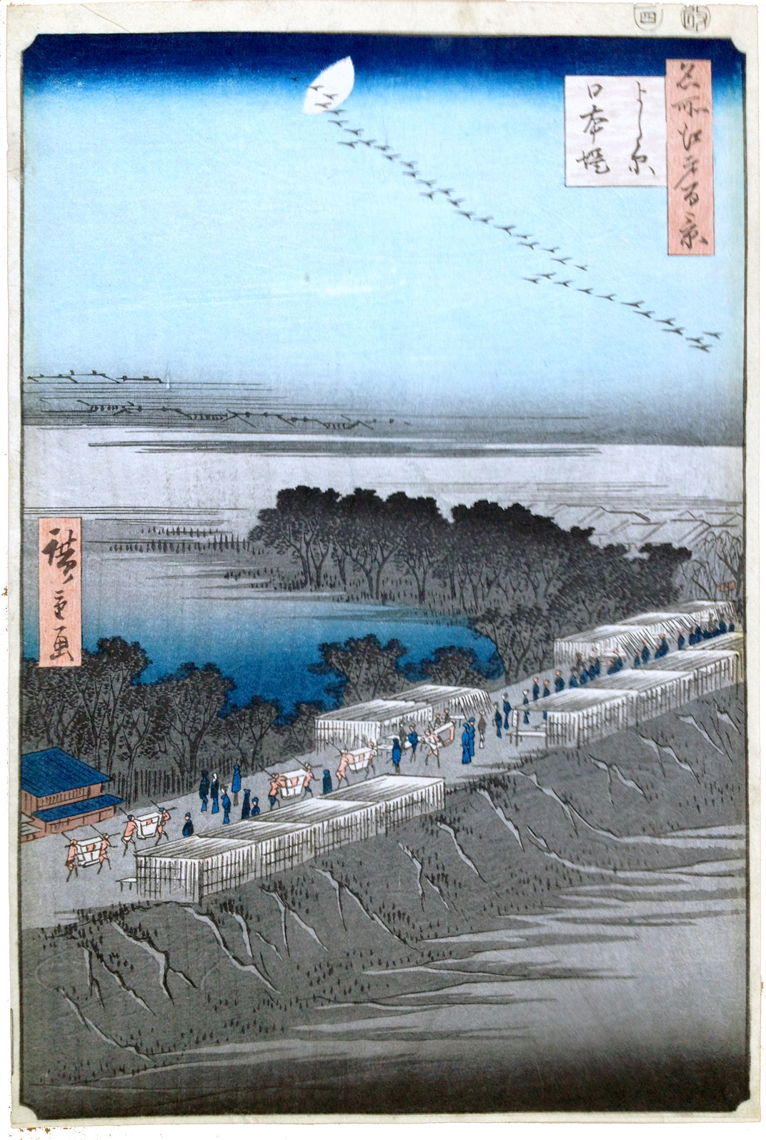 More about this print: Set off as a separate world by the line of rose-tinged clouds are the distant roofs of the Yoshiwara pleasure quarters, the destination of most of those traveling below on the Nihon Embankment.
