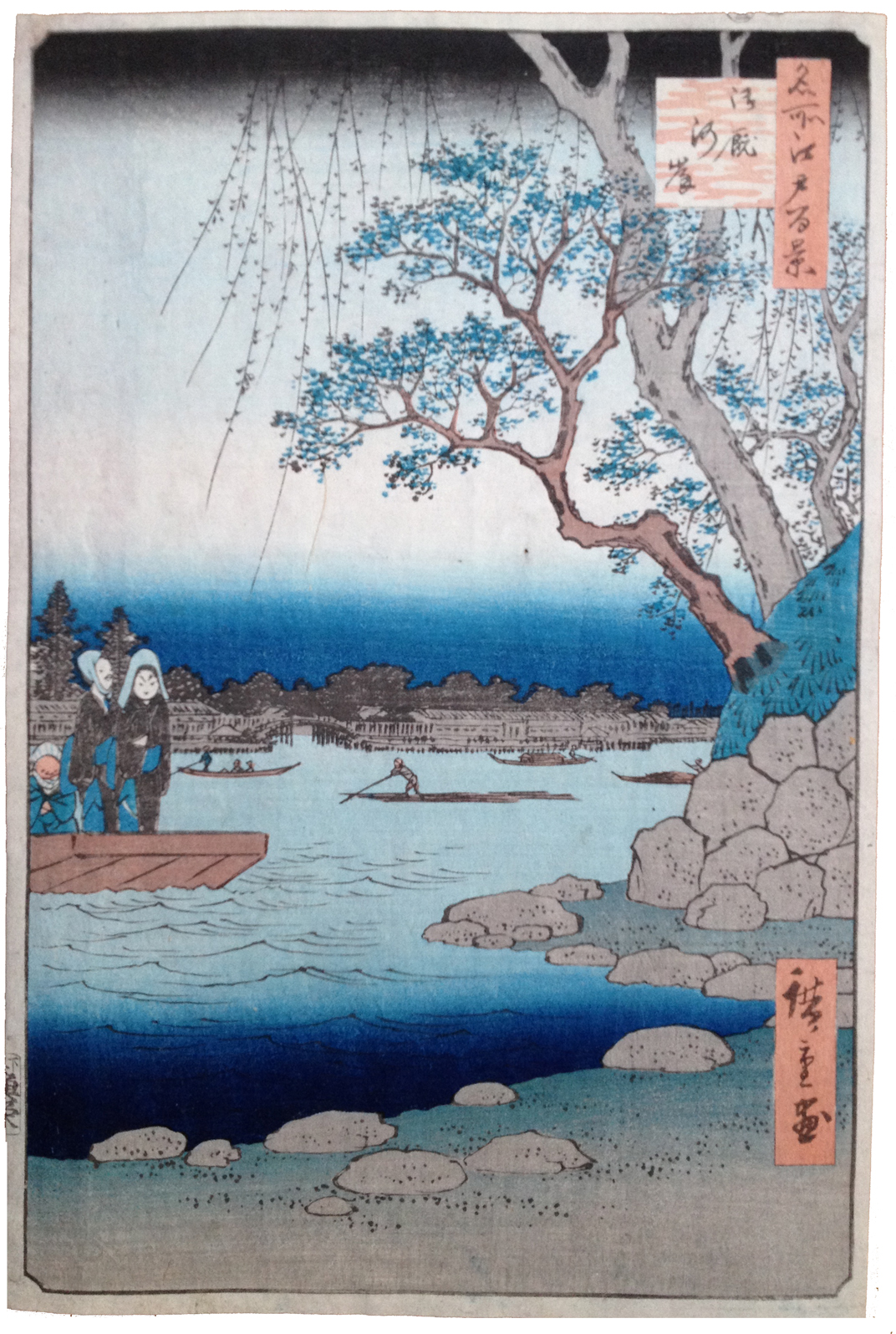 More about this print: It is a murky winter night as the Oumayagashi ferry approaches its landing on the west bank of the Sumida River. The two figures in the bow of the ferry are yotaka, "night hawks"—the lowest class of prostitutes in Edo.