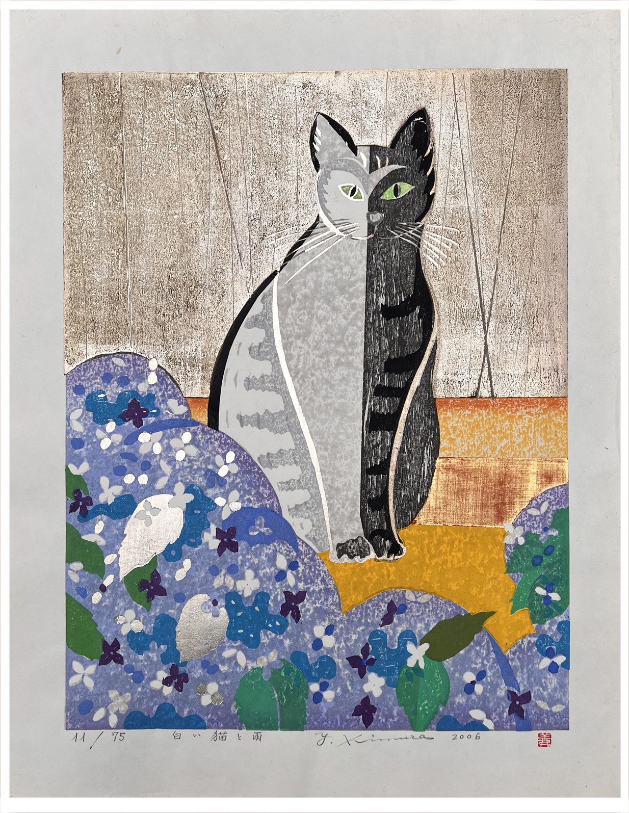 Woodblock Print Title: White Cat and Rain