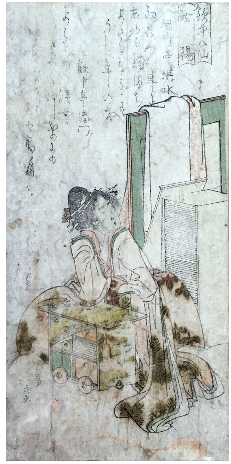 Condition: Backed on an edo era paper. Soiling, rubbing, stained. Some pigments of the dress are oxydized. Colors are faded, consistent with prints from the early 1800's. Poor to fair overall condition.