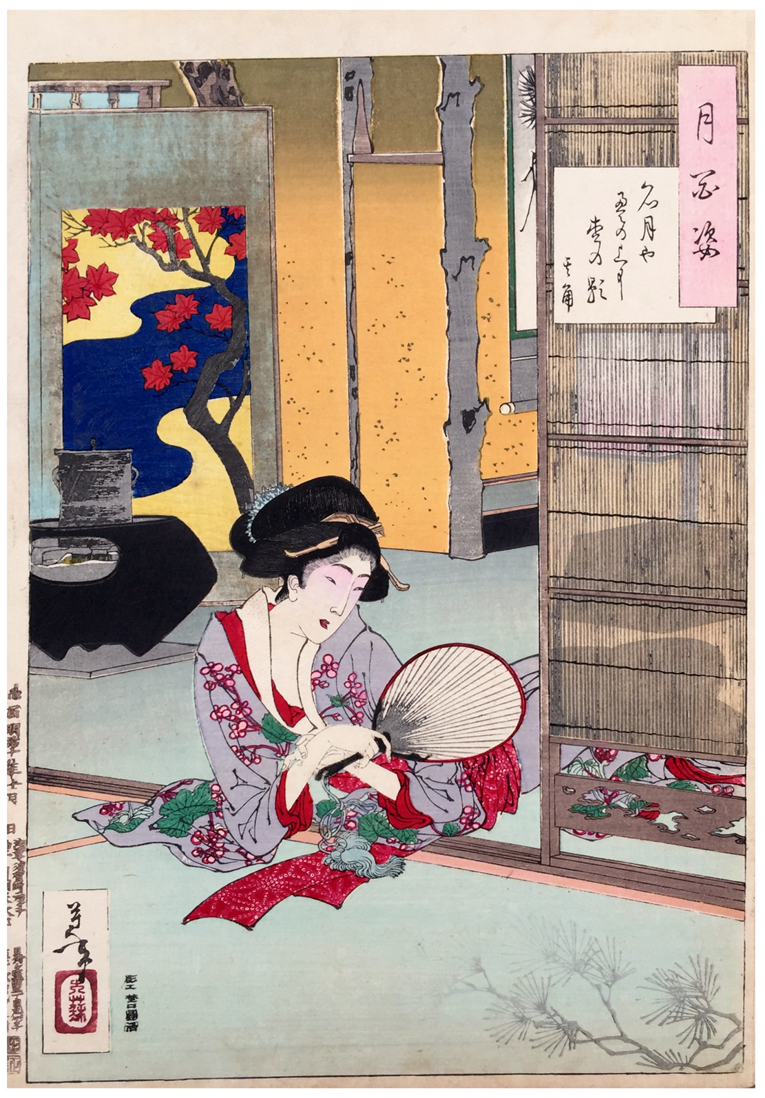 More about this print: This picture illustrates a verse by the celebrated haiku master Takarai Kikaku (1661-1707): "Bright moon - across the tatami mats shadows of pine branches"