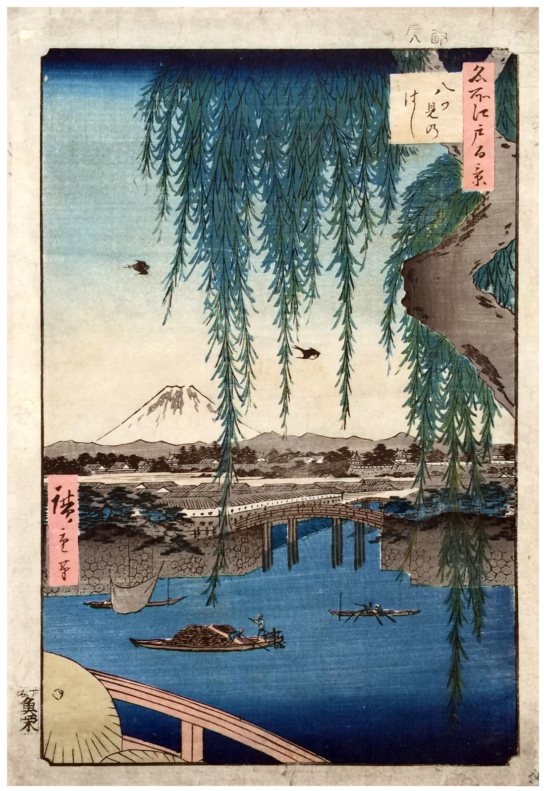 This bridge was one of the busiest in Edo and joined the mouth of the Nihonbashi River with the outer moat of Edo Castle. So heavily traveled was the bridge that its southern approach served as the site of a stone post on which notices of lost children were pasted. The only allusion to this bustling site in an otherwise placid scene is the two parasols moving along at the lower left.