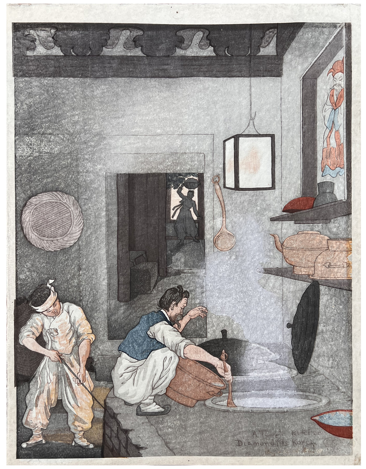 Woodblock Print Title: A Temple Kitchen, Diamond Mountains, North Korea