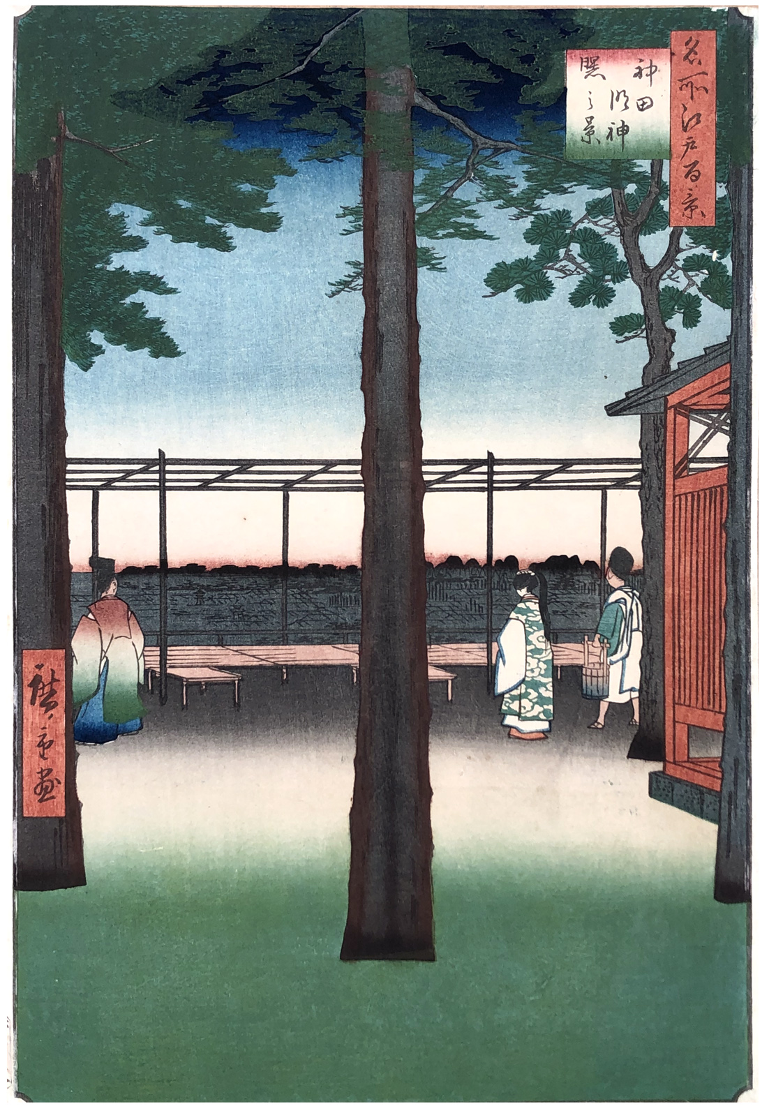 More about this print: For lyrical effect, Hiroshige often chose a quiet moment rather than a time of high activity. Here he offers a side view of Kanda Myōjin—the unofficial shrine of the citizenry of Edo—in the cool dawn, when the benches of the outdoor teahouse lie empty. Only a corner of the vermillion shrine building is visible. The three figures, all keepers of Kanda Myōjin, look out over the city, anticipating the day's activities.