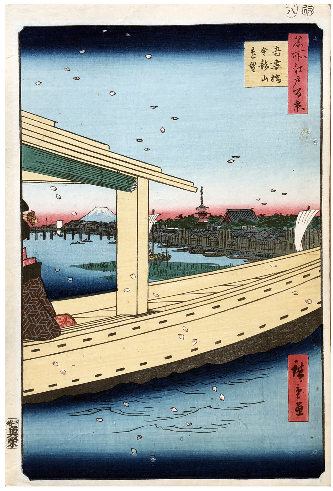 More about this print: The pleasure boat in the foreground of this scene features a stylish, discreetly hidden geisha. Accompanying her would be one or two guests, perhaps another geisha, and no doubt an attendant or two. The shower of petals fluttering by suggests that they have just enjoyed a day viewing cherry blossoms. Beyond is the "distant view" of the title. To the right is the huge main hall and the towering five-story pagoda of Asakusa Kannon Temple (formerly known as Kinryūzan Sensōji), the most ancient and popular Buddhist temple in the city. To the left is Azuma Bridge, the last and northernmost of the four bridges spanning the Sumida River, and beyond in the far distance is the peak of Mount Fuji.