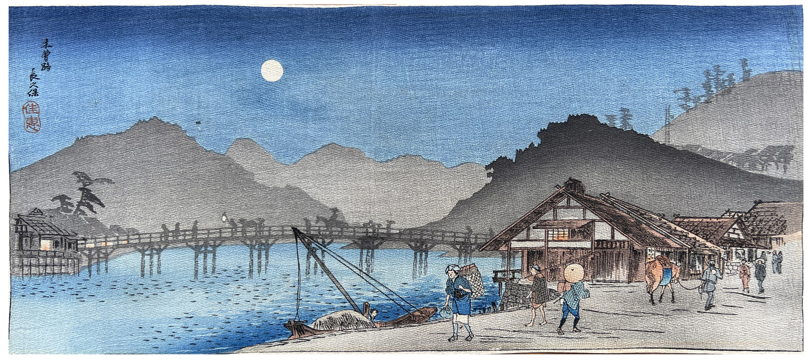 Woodblock Print Title: Evening Village and Bridge