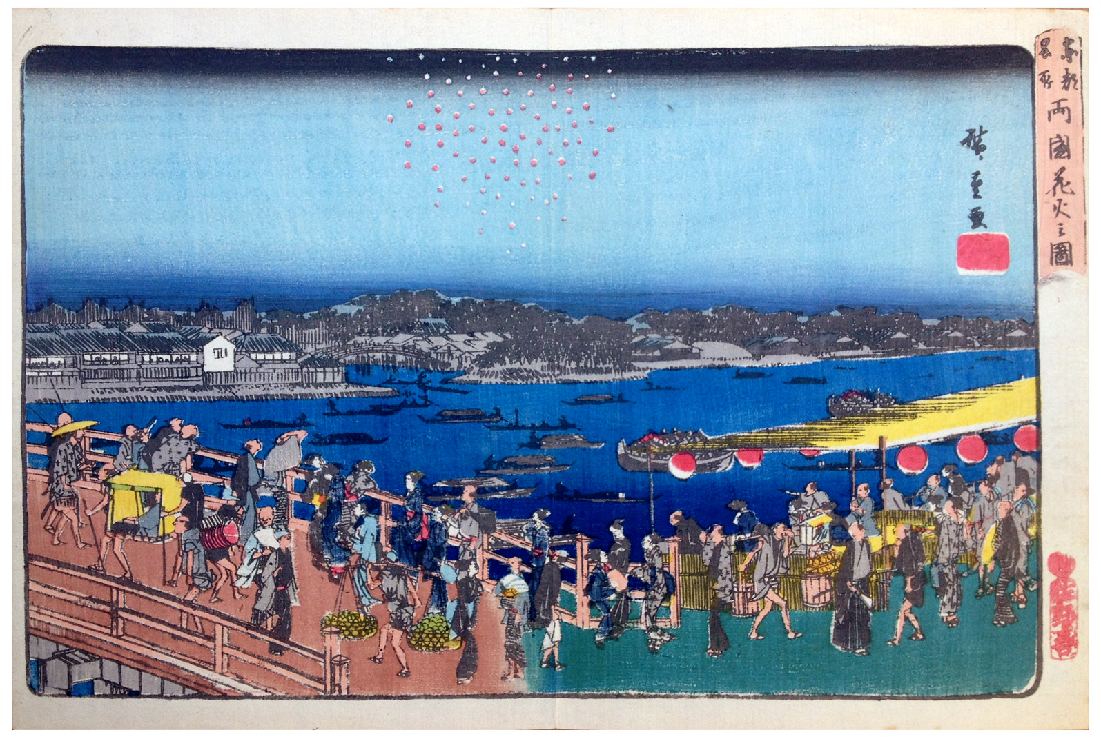 Woodblock Prints Title: Fireworks at Ryôgoku Bridge (Ryôgokubashi hanabi no zu), from the series Famous Places in the Eastern Capital (Tôto meisho)
