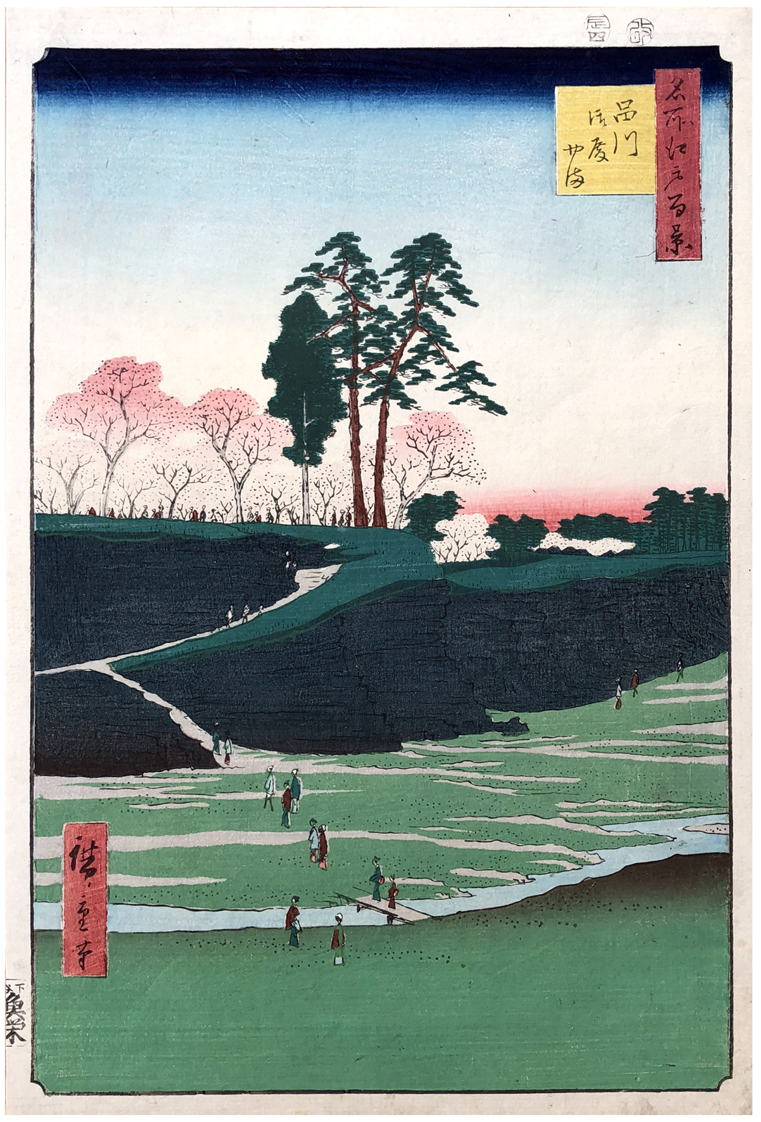 More about this print: Gotenyama, or Palace Hill, was the southernmost projection of the Shinagawa heights. It overlooked the Meguro River to the south and the Tokaido highway to the east as the road passed through the narrow settlement of Shinagawa, gateway to the city of Edo.