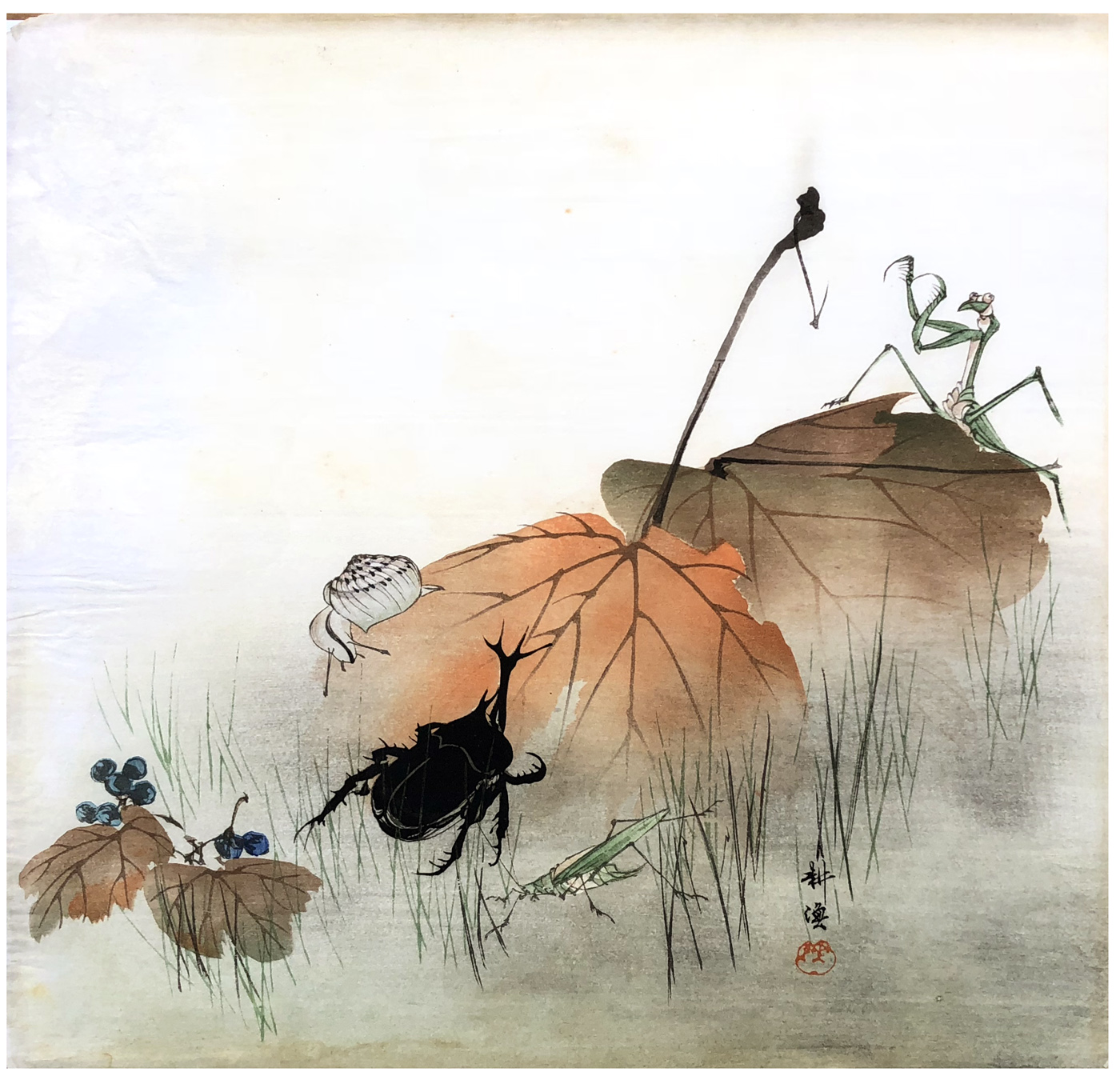 Woodblock Print Title: Mantis Snail Beetle and Grasshopper