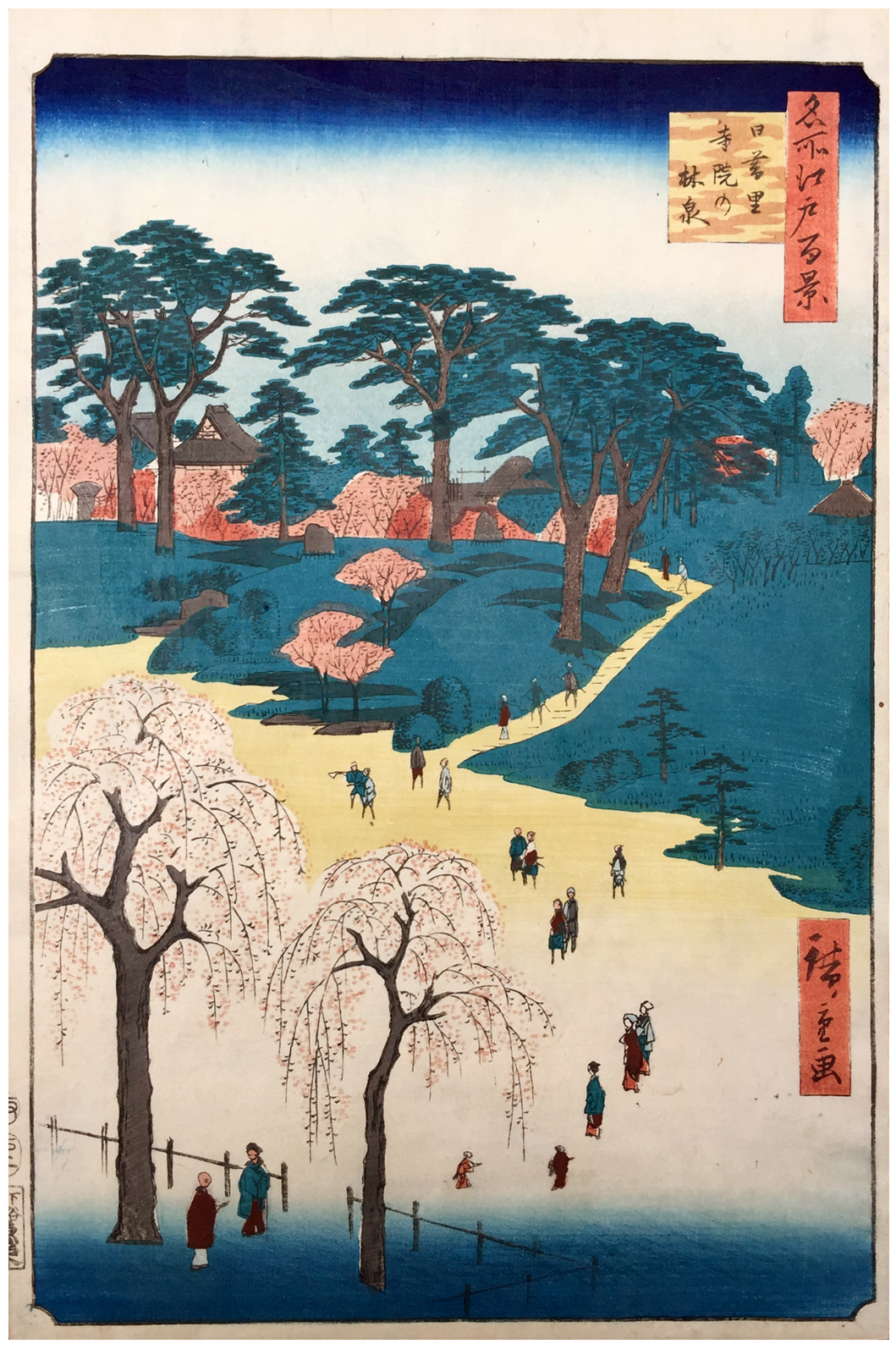 More about this print: In the mid-eighteenth century three Buddhist temples in Yanaka, an area on the outskirts of Edo, entered into a friendly competition of creating unusual gardens to lure visitors from downtown Edo every spring. They became collectively known as the "Flower Temples" or the "Temple Gardens" of Nippori. Hiroshige has depicted one temple, Shūshōin, that was famous for its curious arrangement of artificial mountains and fantastically shaped rocks and trees.