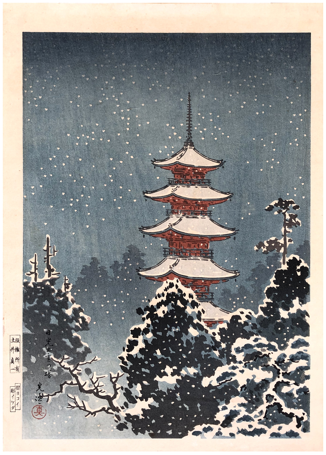 Woodblock Print Title: Nikko Pagoda in Snow