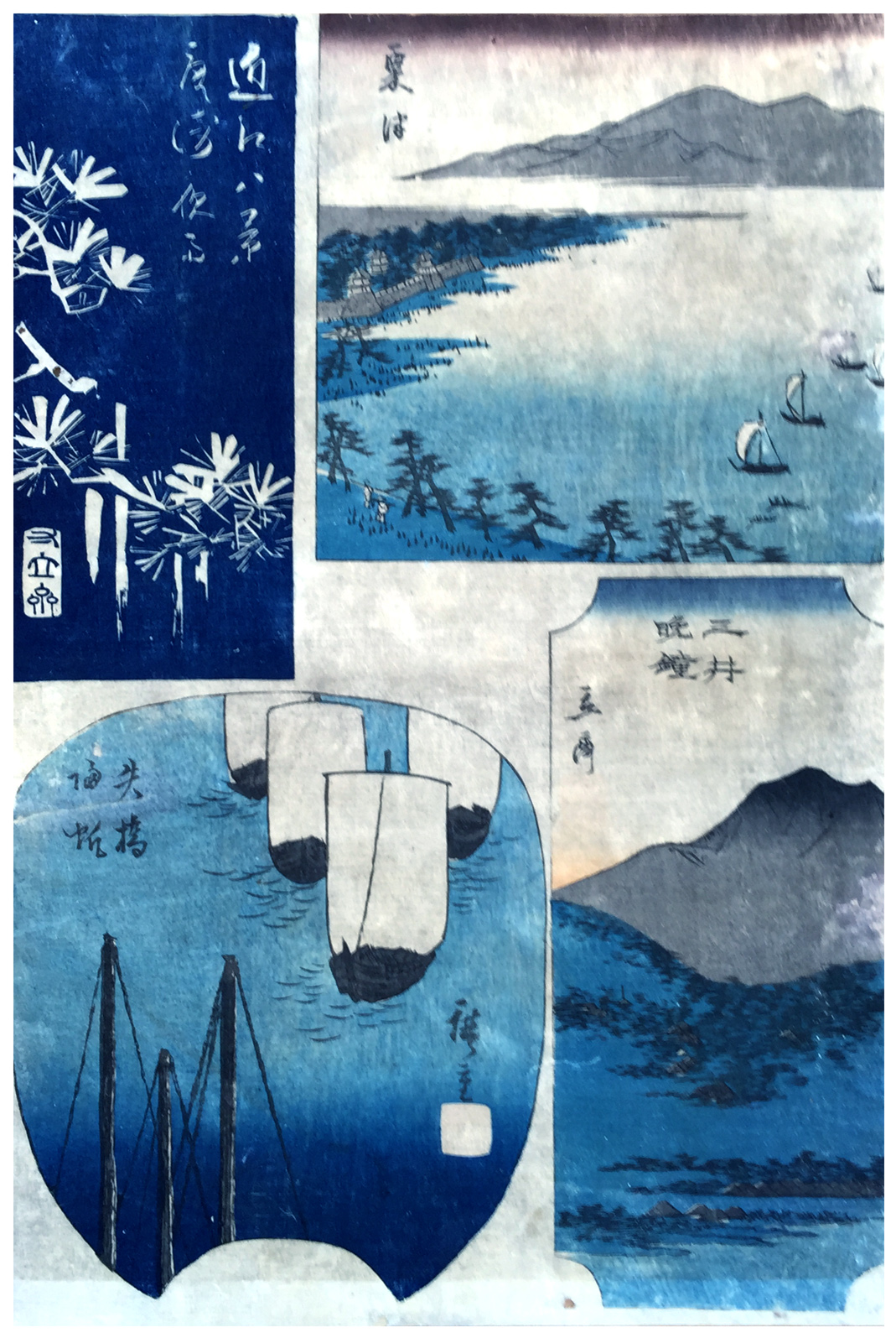 Woodblock Prints Title: Evening Bell at Miidera, Haze on a Clear Day at Awazu, Returning Sails at Yabase, and Night Rain at Karasaki, from the series Eight Views of Omi Province