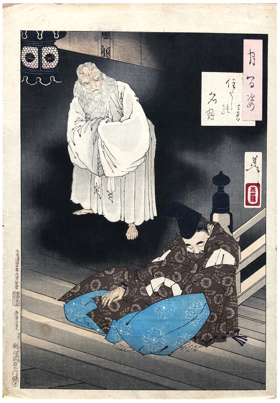 More about this print: On a vigil at the Sumiyoshi Shrine in Settsu, south of the present Osaka, the poet-courtier Fujiwara no Sadaie (Lord Teika) fell asleep. Sumiyoshi no Kami, who is worshipped as the patron of poetry, appeared to him in a dream. According to the Noh play Haku Rakuten, Sumiyoshi was instrumental in saving Japanese poetry from Chinese dominance.