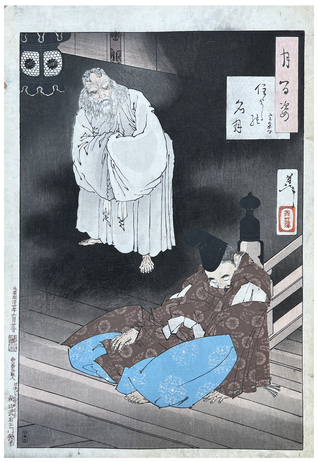 More about this print: On a vigil at the Sumiyoshi Shrine in Settsu, south of the present Osaka, the poet-courtier Fujiwara no Sadaie (Lord Teika) fell asleep. Sumiyoshi no Kami, who is worshipped as the patron of poetry, appeared to him in a dream. According to the Noh play Haku Rakuten, Sumiyoshi was instrumental in saving Japanese poetry from Chinese dominance.