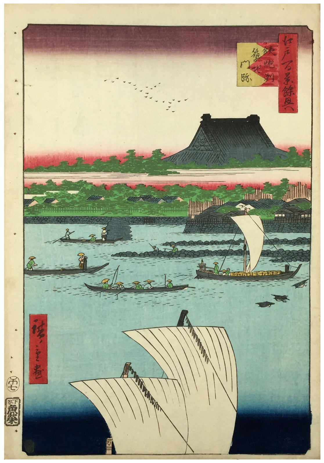 In the distance along the Teppōzu shore is the great Nishi Honganji Temple, the headquarters of one of two rival Buddhist sects. Its main hall was one of the largest buildings in Edo and a familiar landmark both on land and at sea.