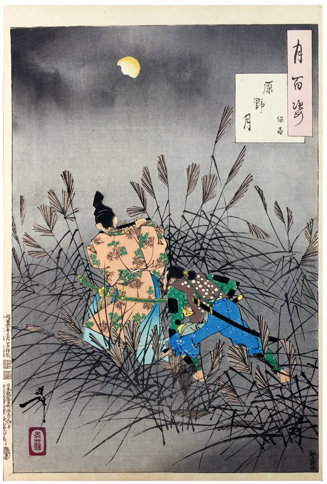 More about this print: The Heian governor and musician Fujiwara no Yasumasa (958-1036) charms his outlaw brother Hakamadare Yasusake by playing the flute. The bandit had planned to rob him, but the music was so beautiful he could not draw his sword. When Yoshitoshi in this series quotes from earlier work, as in this case from his famous 1868 triptych, he often does so with great restraint. See also prints #61, #70, and #85. In this design, the perspective from behind Yasumasa's back, rather than looking him in the face, works admirably well, and helps to condense the scene into one single sheet.