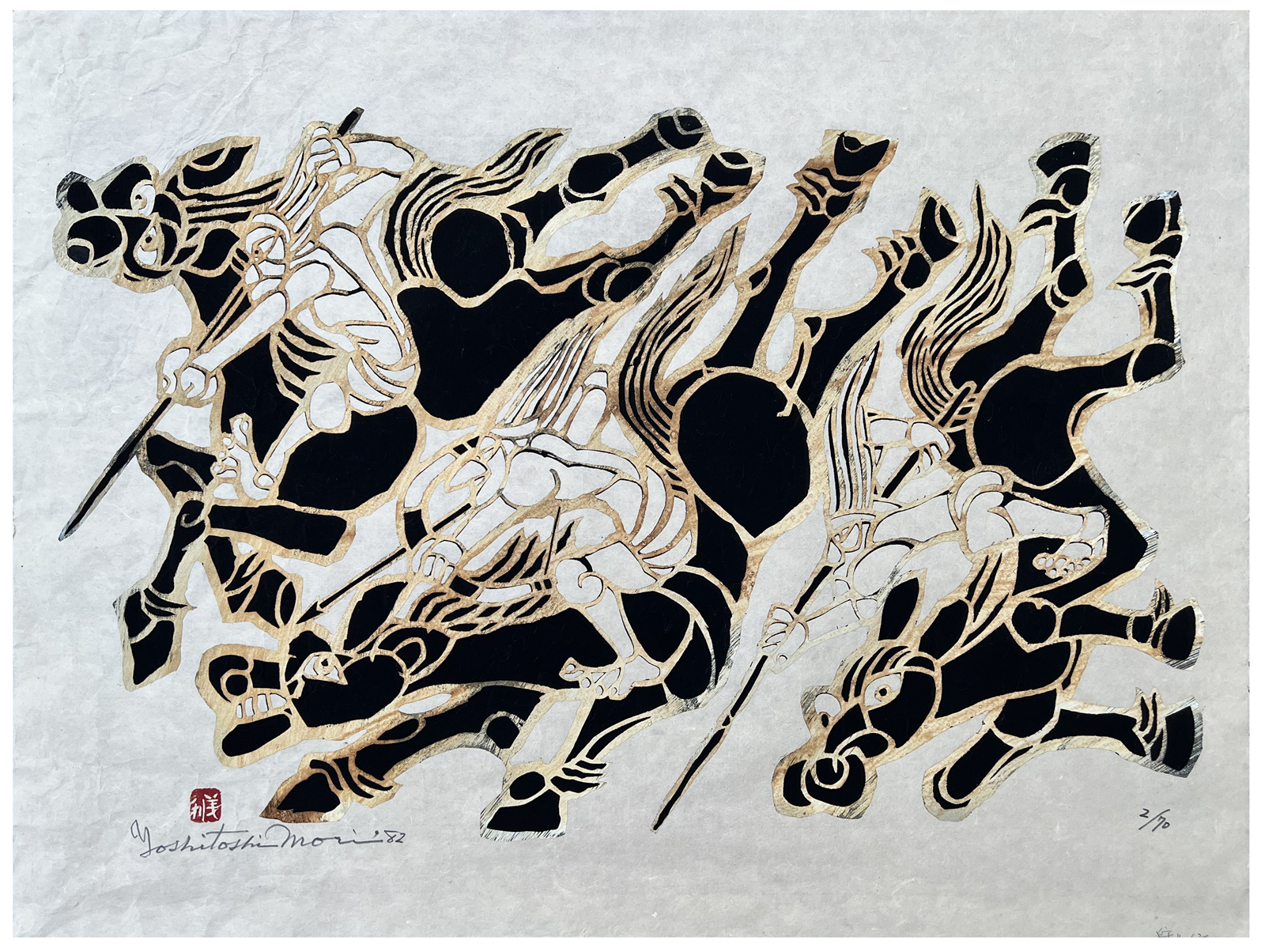 Woodblock Print Title: Three Warriors on Horses