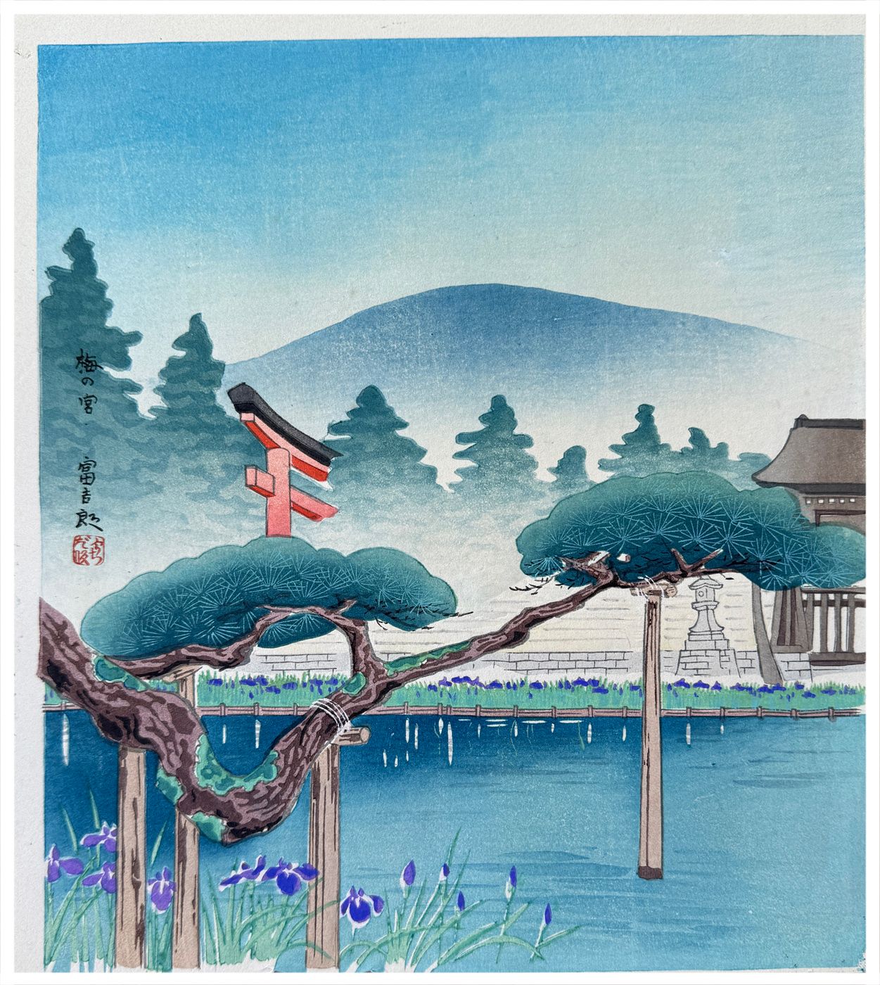 Woodblock Print Title: The Irises of Umenomiya Shrine from the series, "Hanga Kyoraku Ju-go Kei" (Fifteen Views of Kyoto)