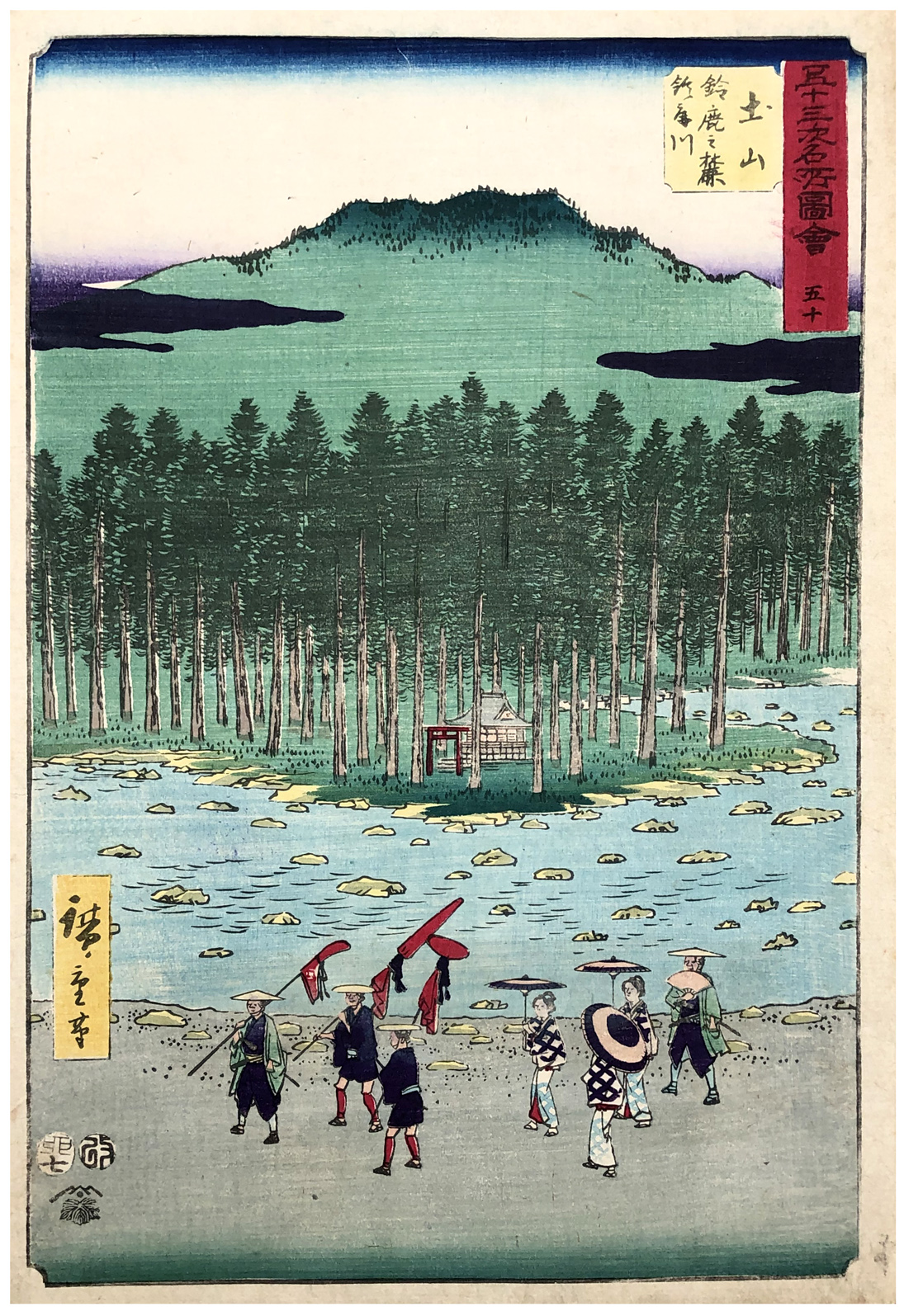 Woodblock Print Title: Tsuchiyama: The Suzuka Foothills and Suzuka River (Tsuchiyama, Suzuka no fumoto, Suzukagawa), from the series Famous Sights of the Fifty-three Stations (Gojûsan tsugi meisho zue), also known as the Vertical Tôkaidô