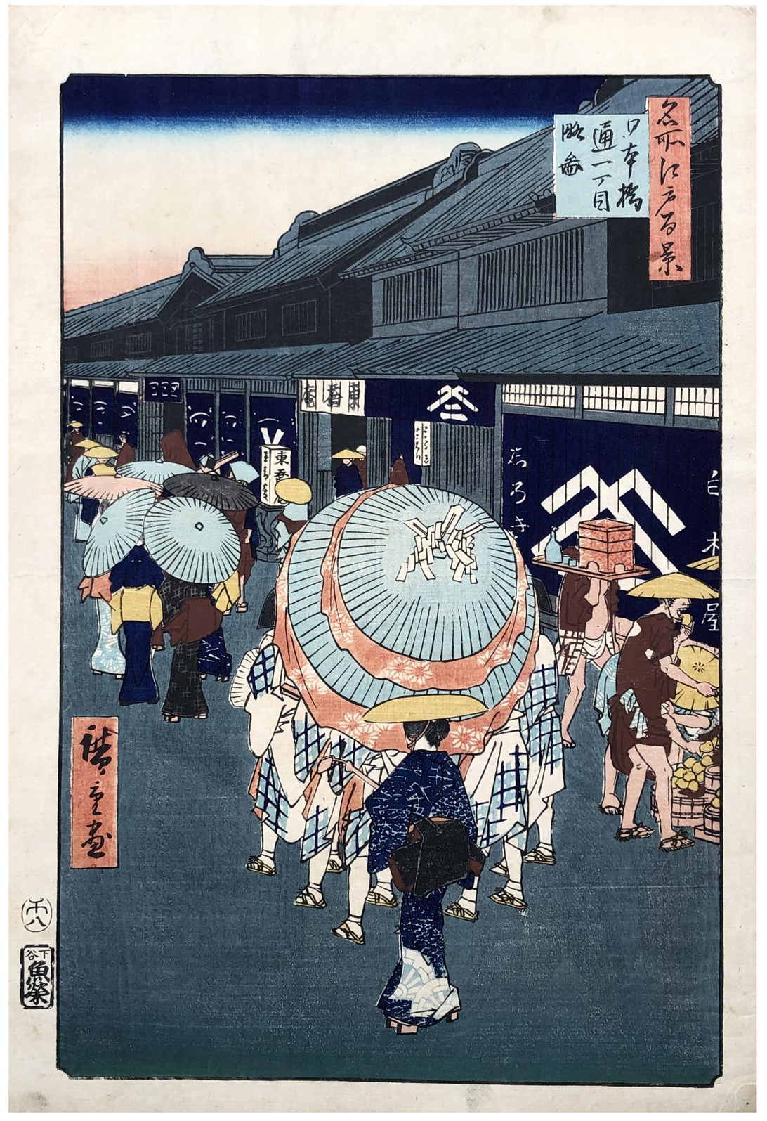 More about this print: It is a hot summer day in the middle of the Main Street of Edo in the bustling Nihonbashi district, and almost everyone hides under a hat or a parasol, intent on avoiding the sun. Under a huge two-tiered parasol is a group of dancers who performed celebratory shrine dances for donations.