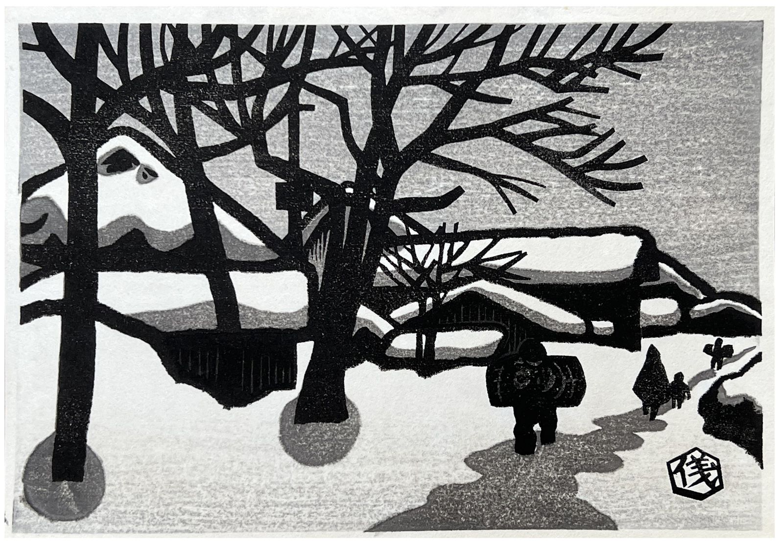 Woodblock Print Title: Walking on a Snowy Trail