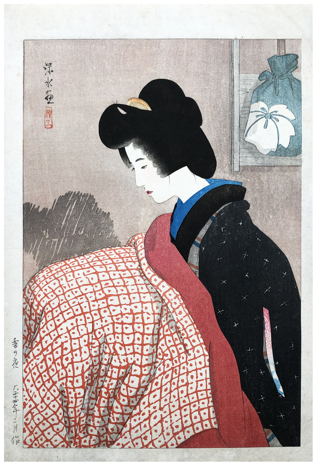 Woodblock Print Title: Woman Warming Herself on a Foot Warmer