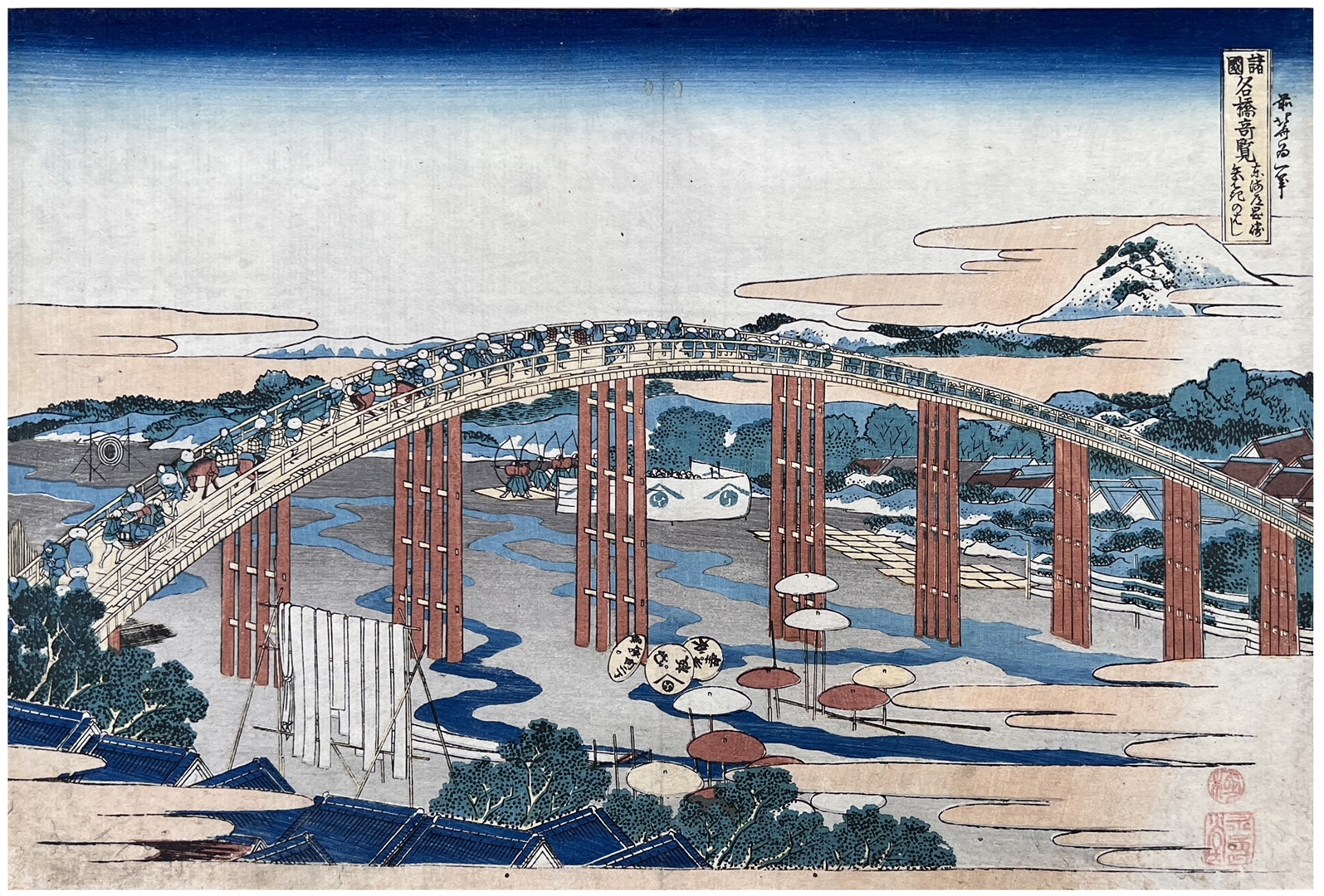 Woodblock Print Title: Yahagi Bridge at Okazaki on the Tôkaidô Road (Tôkaidô Okazaki Yahagi no hashi), from the series Remarkable Views of Bridges in Various Provinces (Shokoku meikyô kiran)