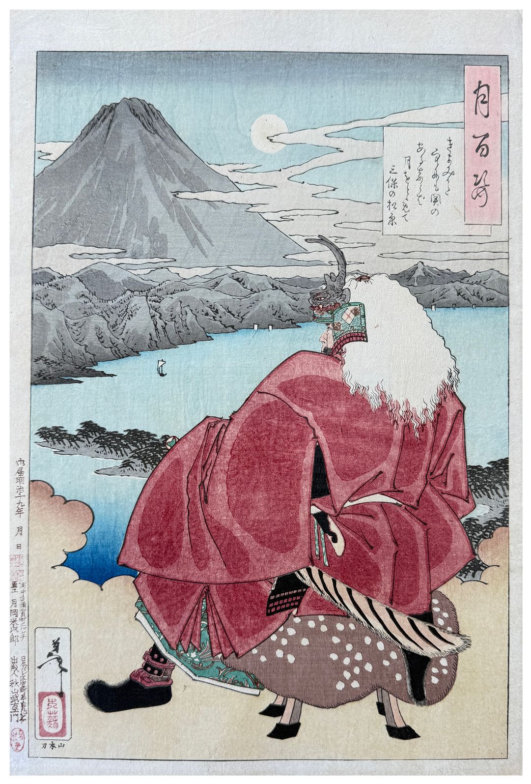 Woodblock Print Title: One Hundred Aspects of the Moon # 41 Moon over the pine forest of Mio Kyomi Coast